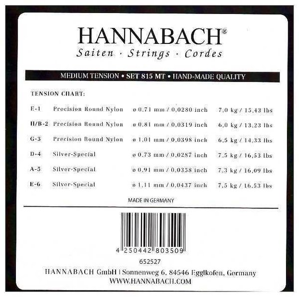 Set Cuerdas Guitarra Clásica Hannabach 815 MT, Medium Tension