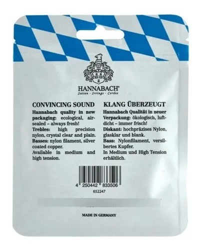 El último desarrollo de Hannabach. Agudos de alta precisión, claros y lisos. Cuerdas graves con filamentos de nylon en el núcleo y entorchado de hilo de cobre bañado en plata. Nuevo sistema de identificación de cuerdas: Cuerdas graves marcadas y cuerda B marcada en color. Nuevo envase herméticamente sellado, ahorro de espacio y rentable.